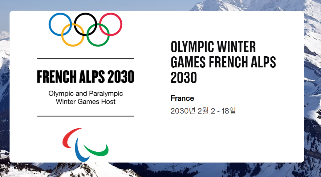 다음 대회는 2030년에 개최된다. 공식 명칭은 2030 Winter Olympics이며 개최지는 French Alps, 즉 France 알프스 지역이다. 이번 대회는 프랑스 여러 도시가 분산 개최 방식으로 참여할 예정이다. 알프스 산맥의 자연 지형을 활용해 설상 종목 중심의 운영이 예상된다.
